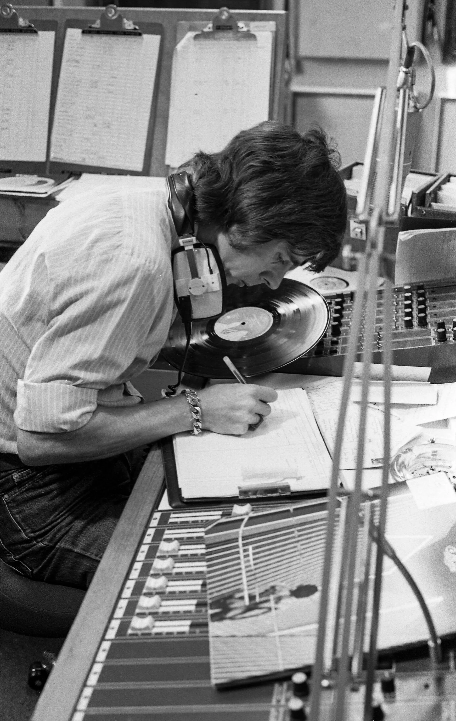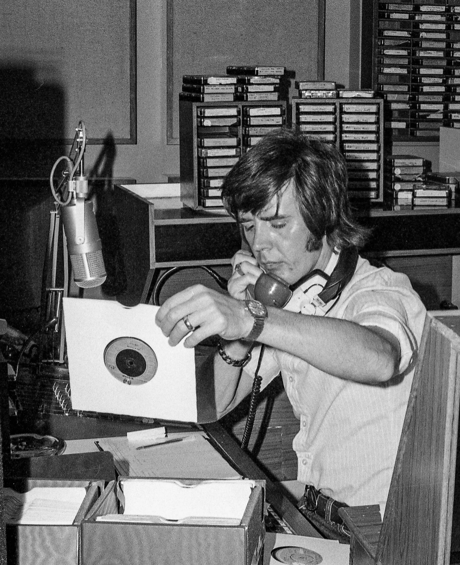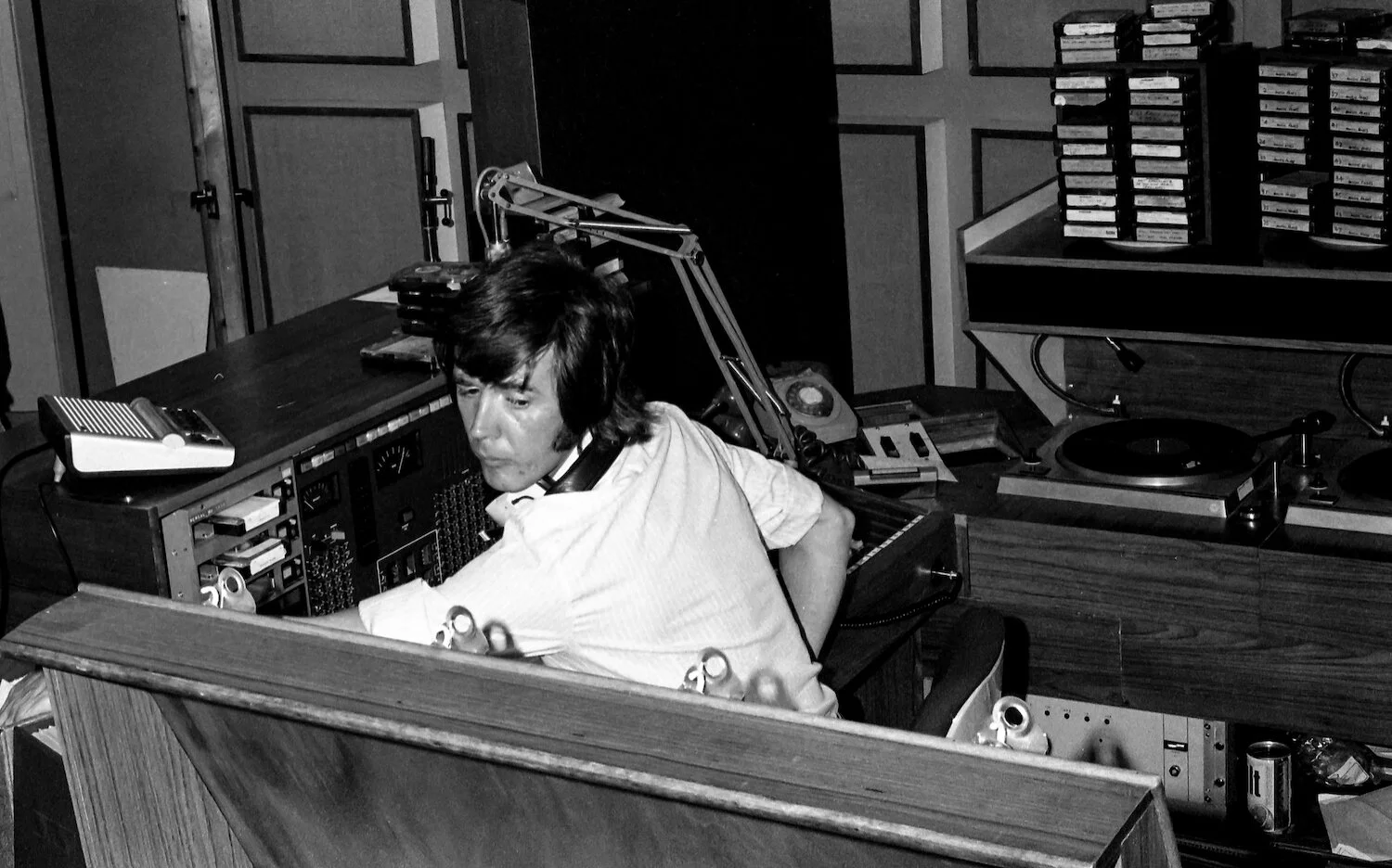 These photographs were taken during a visit to the original Radio Clyde studios in the Anderston Centre in Glasgow. They were taken during a live broadcast by a young Tom Ferrie assisted by his Producer, Roy Jones. They show the level of technology employed at the time. There are no computer screens, with everything being manually recorded with paper and pen. Postcards can be seen on the desk. These were the standard way of requesting dedications and songs to be played at the time. They were still in the days of vinyl but had jingles and adverts on audio cartridges. Also note the ashtrays and smoking being permitted whilst at work.